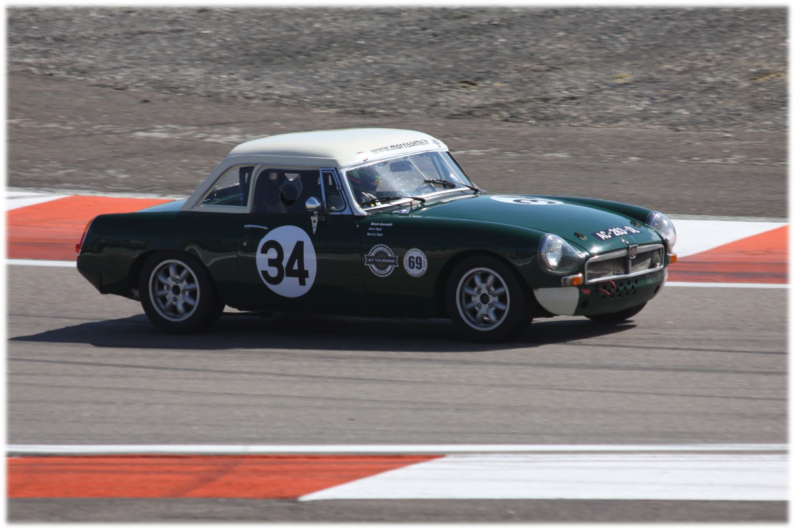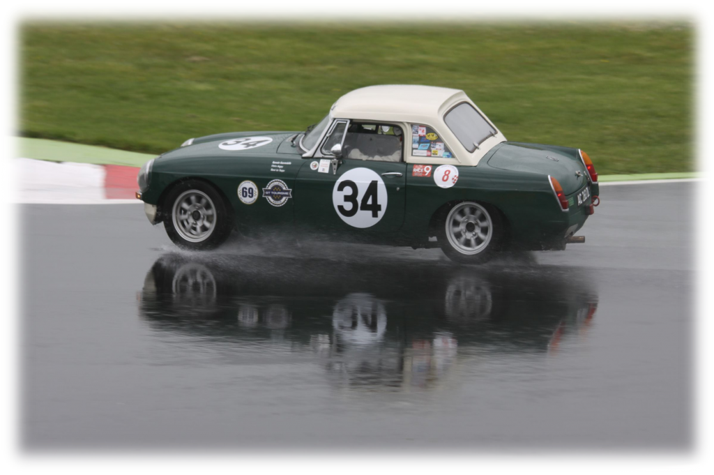 Les deux sessions suivantes se déroulent alternativement sur piste séchante ou sur piste se chargeant en eau mais offrant tout de même des conditions proches du sec. La MG B s’en donne à cœur joie tout comme ses voisines américaines du plateau Old Competition et le rythme augmente petit à petit. Une bataille s’engage avec une Lotus Elan qui occupera Morrissette une bonne partie de la session. A ce moment, nous ne le savons pas encore mais ce sont nos derniers tours du weekend sur piste sèche. Morrissette rentre se reposer sous son barnum à coté de deux Ford GT40 et petit à petit le ciel s’assombrit et des trombes d’eau commencent à s’abattre sur le circuit de Nevers Magny-Cours.